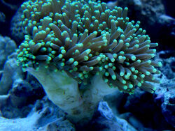 Halte diese schöne Koralle nun schon knapp drei Monate bei 6 x 80 Watt T5 bei mittlerer Strömung etwa 25 cm unter Oberfläche. Hat erst mal reichlich Platz zum wachsen,allerdings ist sie schon um gut ein viertel gewachsen ...