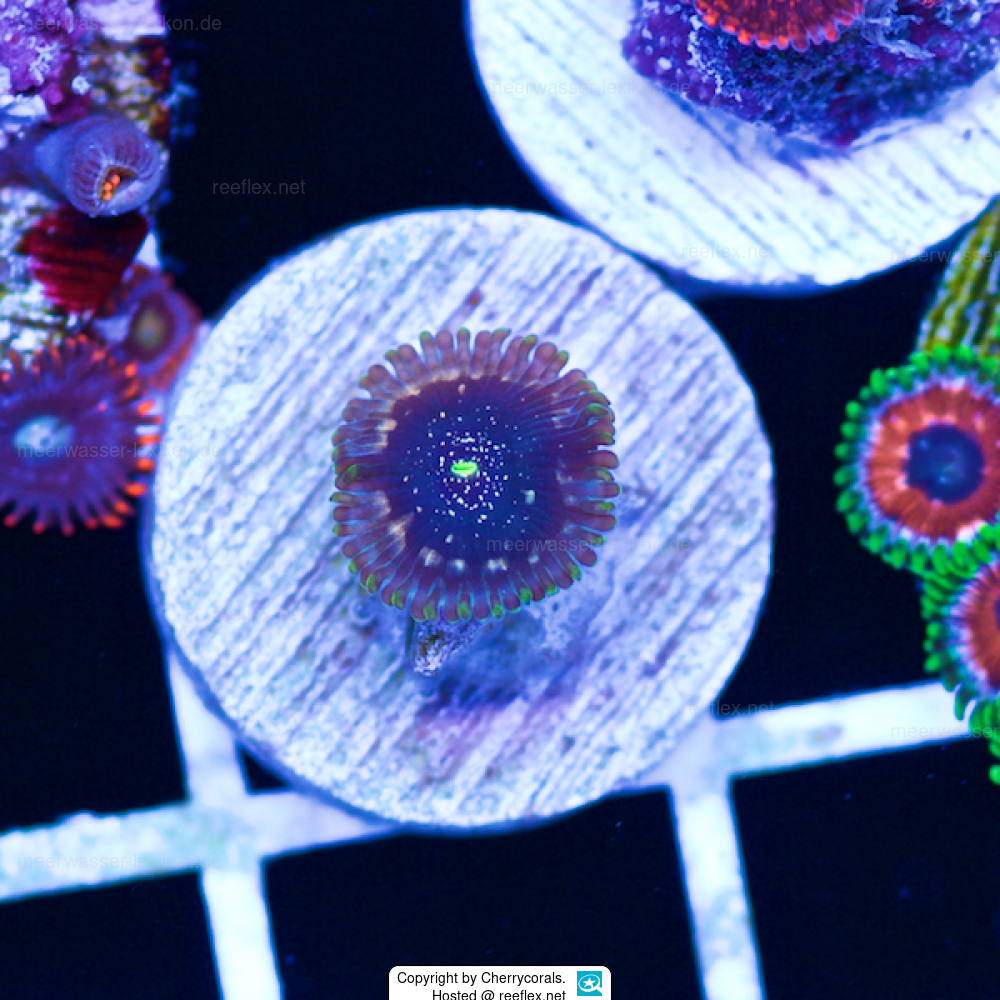 Diese wunderschöne Krustenanemone kommt unter dem Handelsnamen Zoanthus/Palythoa "Galaxy PE" in den Handel, zumindest beim bekannten Korallenversender "Cherrycorals" Wir danken Cherrycorals für die Nutzung des Fotos .