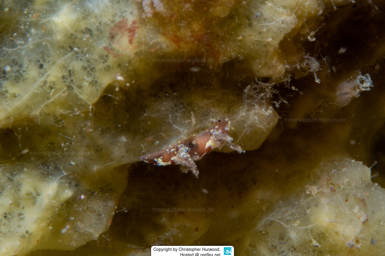 Die kleine Nacktschnecke ist durchscheinend weiß oder blass rot-braun mit einem hellbraunen Netzmuster, das unregelmäßige Flecken auf dem Körper bildet. Es gibt runde gelbe Flecken auf dem Kopf, hinter den Rhinophoren, hinter den Kiemen und auf den Rhinophoren und Kiemen, alle innerhalb der weißen Bereiche.