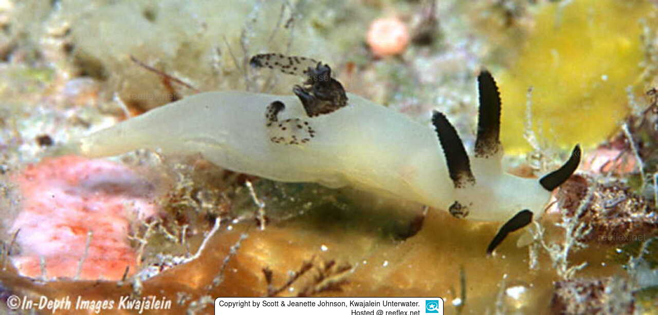 Das Fortpflanzungssystem ist als zwei pfirsichfarbene Kugeln in der Nähe der rechten Seite der Tiere etwa auf halber Strecke zwischen den Rhinophoren und Kiemen zu sehen.