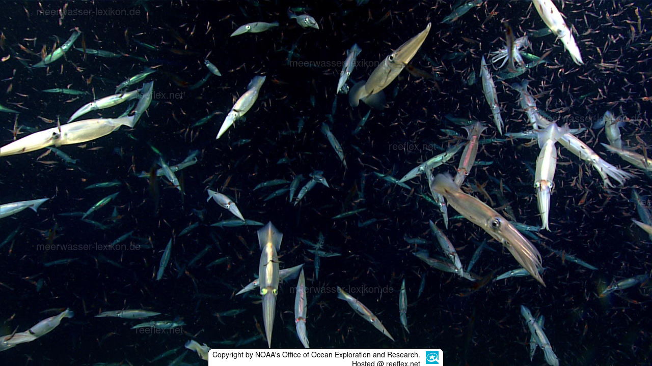 Wie auf den tollen Fotos der NOAA Ocean Exploration & Research sehr schön zu erkennen, kommt der etwa 30cm große Kurzflossenkalmar nachts in großen Stückzahlen in oberflächennahe Wasserzonen, um sich am aufsteigenden Zooplankton richtig satt zu fressen.