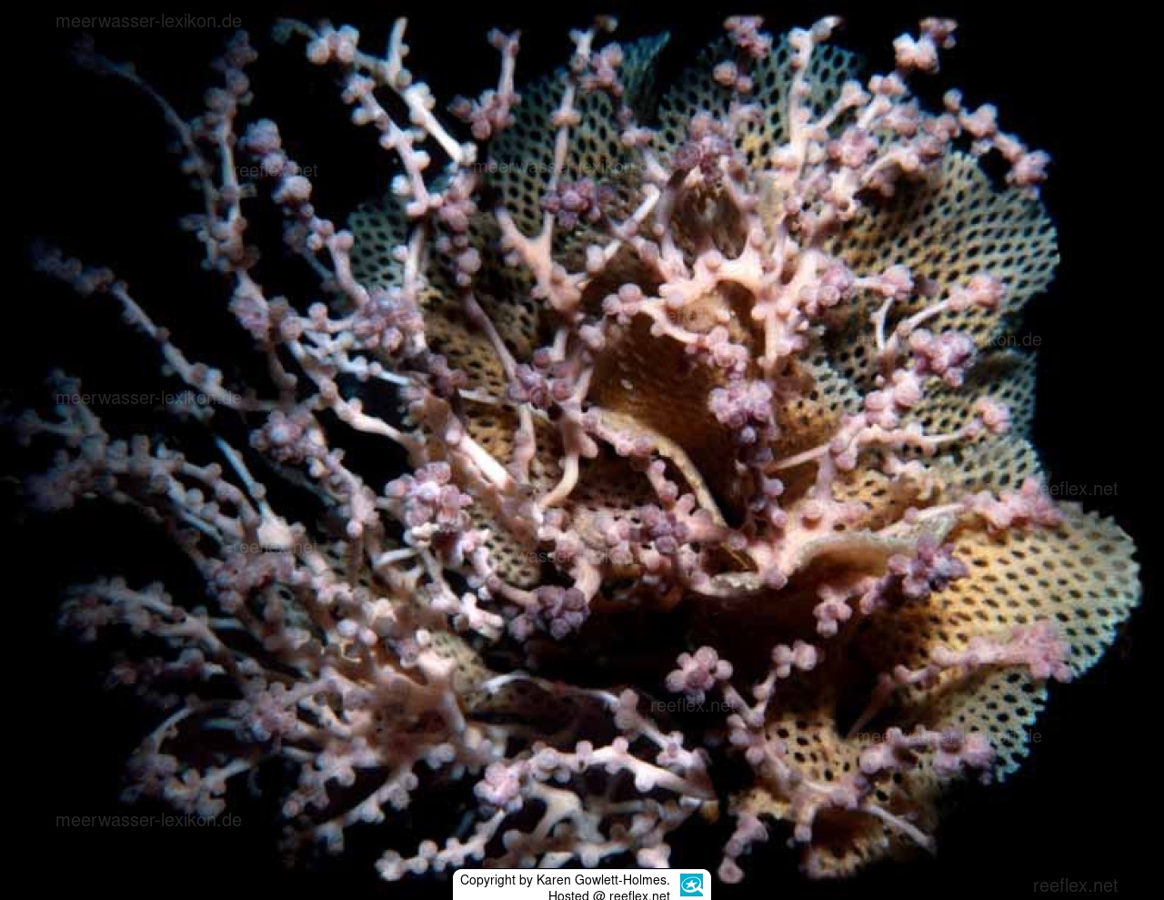 Das erste und unseres Wissens einzige in situ Foto von Karen Gowlett-Holmes zeigt die Koralle Asperaxis karenae mit dem Moostierchen Triphyllozoon floribundum (Hayward, 1999) im Hintergrund.
