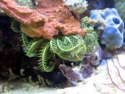 Nach nun deutlich über drei Jahren kann ich immer noch sagen das er sich, im Gegensatz zu anderen Arten, im Gemeinschaftsaquarium halten lässt. Bei anderen Arten (gelb, rot, mehrfarbig) wird das nur gehen wenn man eine hohe Futterdichte in einem kleinen Behältnis anbietet. Das wieder herum kann die Wasserwerte dem ensprechend beeinflussen. Nun aber wieder zum grünen Haarstern. Auch bei ihm muss demensprechend gut gefüttert werde, bzw. das Futter das dem Becken zugeführt wird muss an ihm vorüberziehen. Er sitzt seit langer Zeit nun in einer roten Montipora und versteckt sich nicht durch einrollen, was man oft bei anderen Arten beobachten kann.
