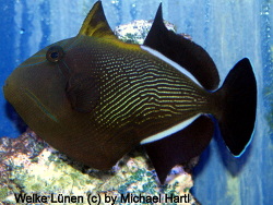 Er scheint weniger agressiv zu sein als andere Drückerfische, sollte aber trotzdem nicht mit zarten Geschöpfen (kleine Fische) vergesellschaftet zu werden.