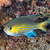 Die blaue Farbe ist auch auf den Lippen, dem dorsalen, dunkle Augenfleck und auf den Beckenflossen zu sehen, die Schwanzflosse ist gelb.