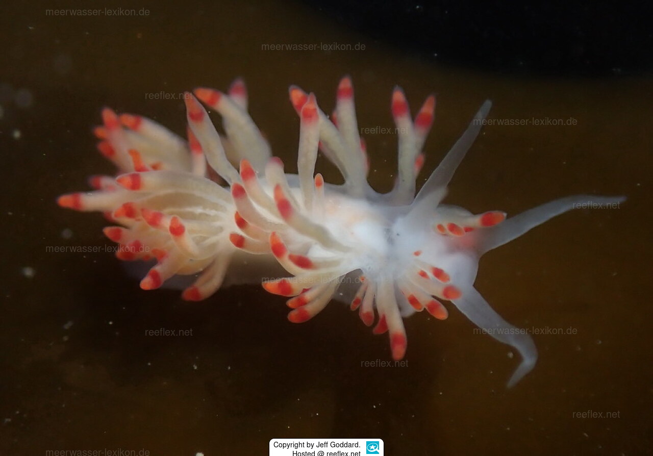 Der Körper ist durchscheinend weiß, gelegentlich mit einer undurchsichtigen weißen Linie in der Mitte des Rückens und entlang jeder Seite. Die länglichen Cerata können milchige bis blass olivfarbene Kerne mit leuchtend gelblich-orangefarbenen Spitzen und einem subapikalen roten Band haben, oder das subapikale rote Band kann in leuchtendes orange übergehen und sich mindestens bis zur Hälfte erstrecken.