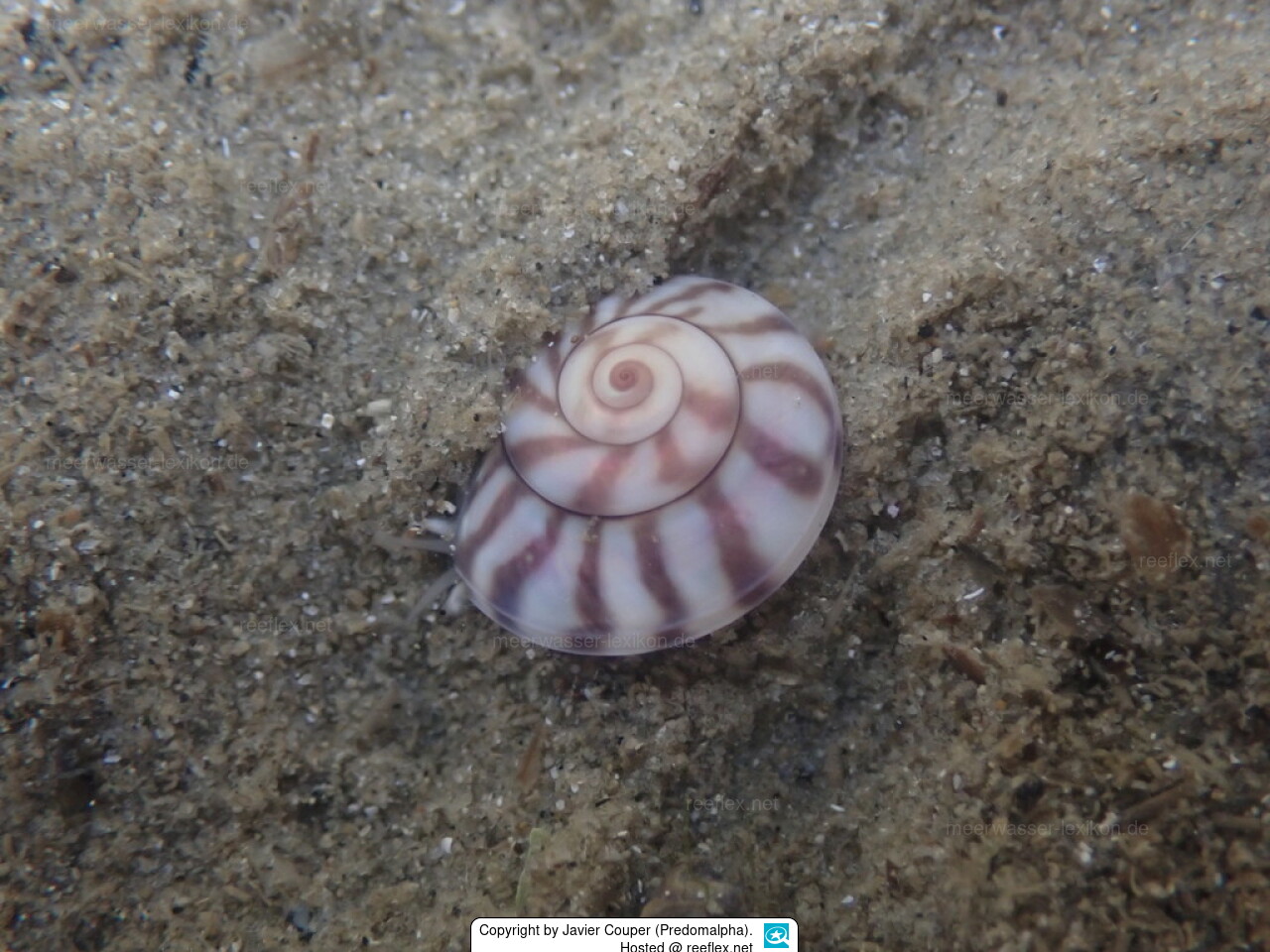Die Länge der Schale variiert zwischen 15 mm und 22 mm, die feste Schale ist eingedrückt und unperforiert. Die Farbe ist gelblich oder rosafarben, oben strahlenförmig kastanienbraun oder rot gestreift, an der Basis mit einer rötlichen oder violetten Zone um den zentralen Kallus, der äußere Teil weiß, mehr oder weniger strahlenförmig gestreift. Die glänzende Oberfläche ist glatt. Die Basis der Schale zeigt unter der Linse sehr feine, dichte, regelmäßige Spiralstreifen.