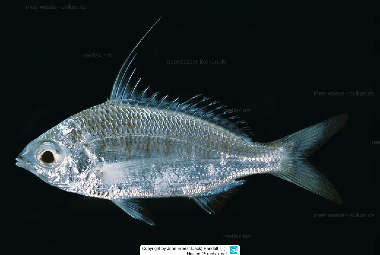 Ähnlich wie Gerres filamentosus mit dem langen Filament an der Rückenflosse, aber anstelle von Flecken, hat Gerres macracanthus vertikale Streifen an den Seiten.