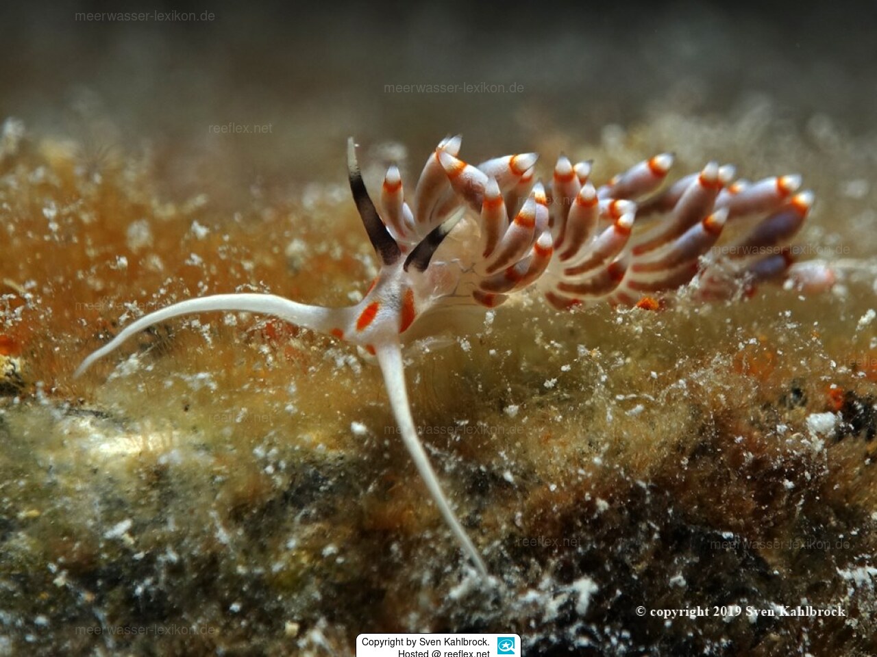 Der Körper ist durchscheinend, wobei die blass orange-rosa Eingeweide durch die Körperwand sichtbar sind. Es gibt eine einzelne weiße Mittellinie, die manchmal unterbrochen ist und vom Kopf bis zur hinteren Fußspitze verläuft. Es gibt auch eine weiße Linie auf jeder Seite des Rückens, die an jedem Cerata-Cluster unterbrochen ist. Auf jeder Seite befindet sich eine weitere weiße Linie, die unterhalb der Cerata vom Kopf bis knapp unter die letzten Cerata verläuft.