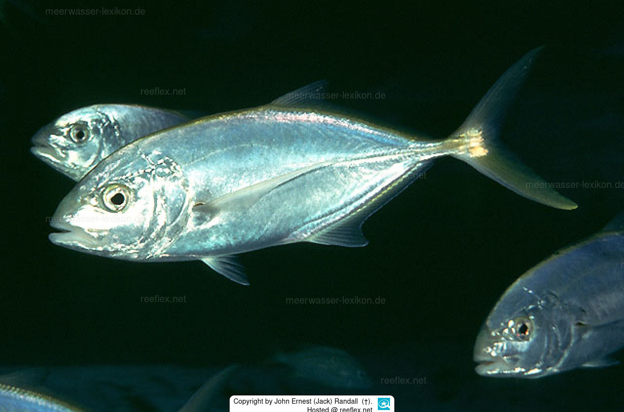 Adulte Tiere sind silbrig, mit einem gelben Schimmer und gelben Flossen, Jungtiere sind an einem dunklen Balken vom Auge bis zum Maul zu erkennen.