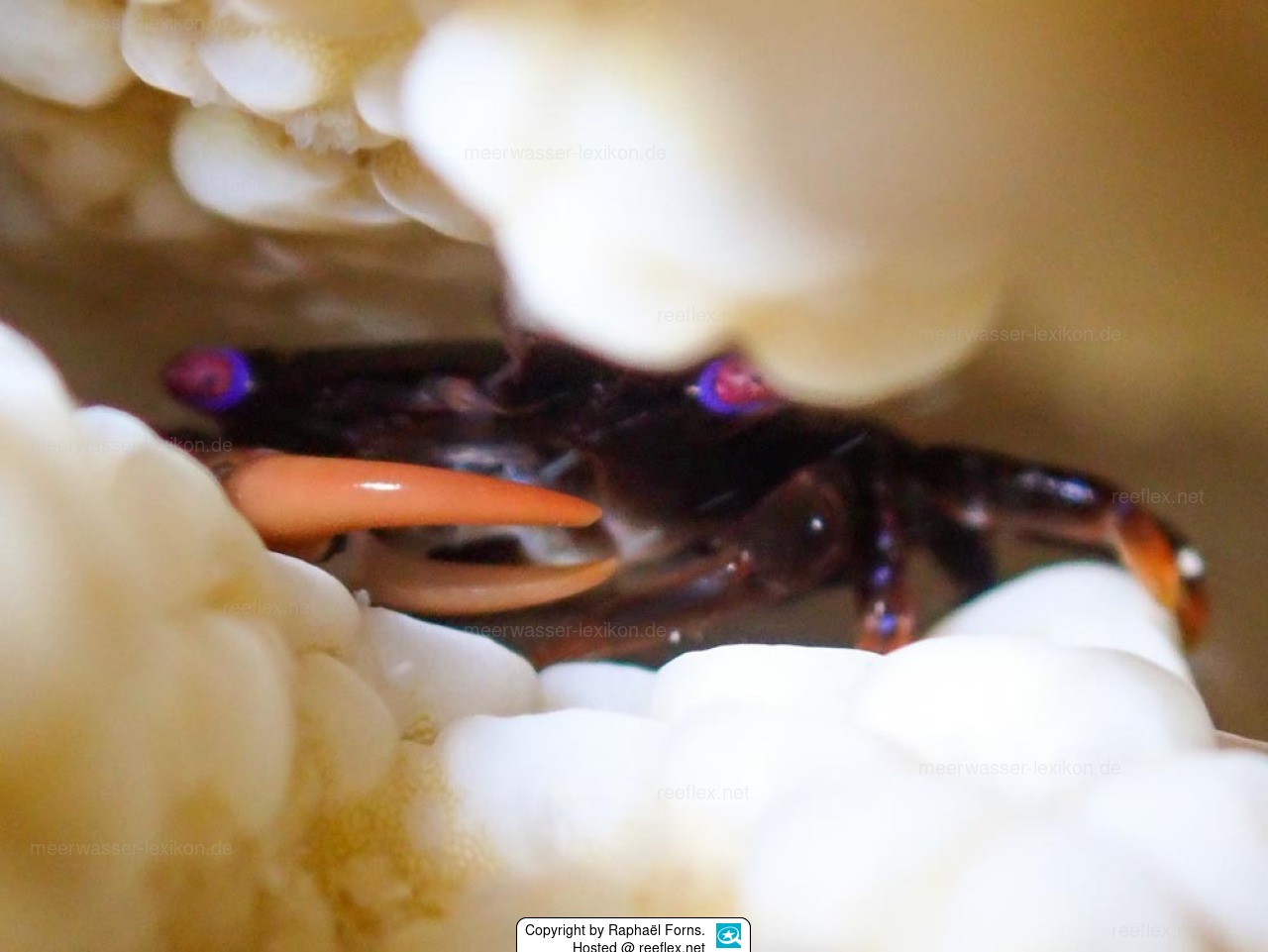 Verwechslungsmöglichkeit besteht mit der Korallenkrabbe Tetraloides heterodactylus. die im gleichen Lebensraum und Habitat auf Acropora Korallen lebt, jedoch keine roten Augen und wunderschöne blaue Punkte hat.