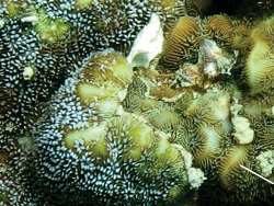 Das lebende Gewebe um die Mundöffnung und die Mundscheibe ist weiß bis hellgrau, die Tentakel sind in der Regel weiß und verleihen der Kolonieoberfläche ein bärtiges Aussehen