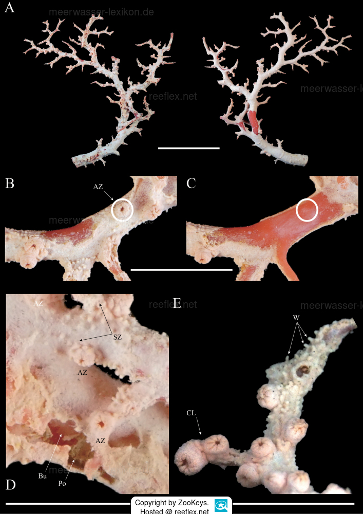 Ähnlich wie beim Holotyp verzweigt sich die Kolonie in einer einzigen Ebene, wobei die kontrahierten Autozooide nur auf einer Seite der Kolonie verteilt sin.