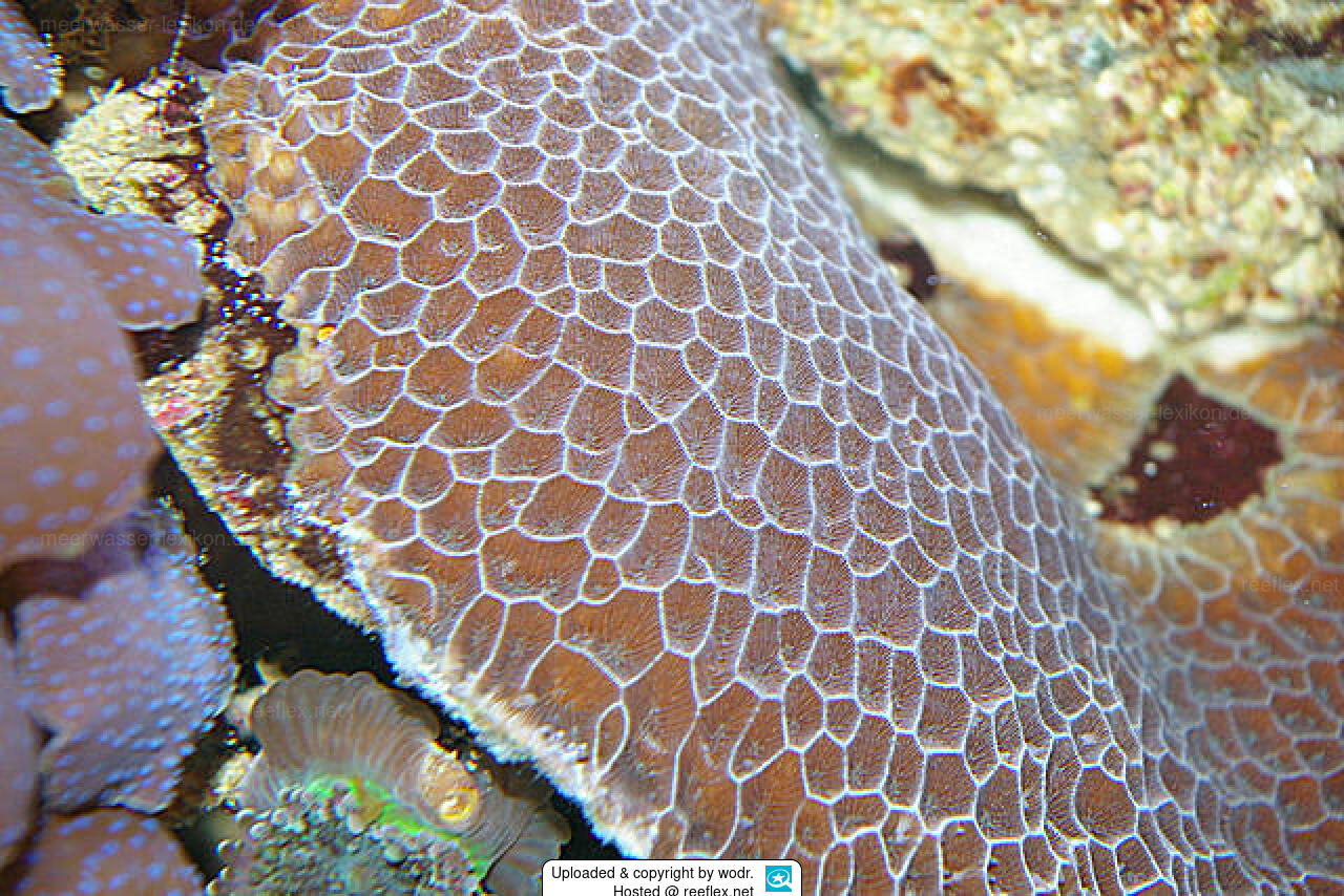 Beschreibung Gardineroseris planulata: Die Kolonien sind massiv und erreichen einen Durchmesser von 1 m. Die Kelche sind polygonal, nicht rund, und haben einen Durchmesser von 3 bis 5 mm. Die Innenwände erscheinen dem bloßen Auge als glatte, konkave Oberflächen, da die Septen sehr zahlreich, dicht beieinander und von gleichmäßiger Höhe sind. Hohe Korallitwände können eine einzelne oder eine trennende Gruppe von Koralliten umgeben. Die Art ist häufig an Riffhängen in klarem bis mäßig trübem Wasser, von der Nähe des Riffkamms in geschütztem Wasser anzutreffen.