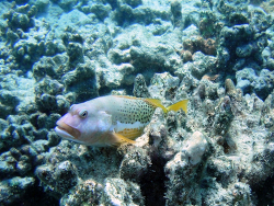 Sitzt oft erhöht auf Korallen, (exponierte Stellen) von wo aus, er das Geschehen im Aquarium beobachtet. Garnelen dürften, wie bei fast allen Fischen dieser Art, ein Problem werden. Sie haben sie zum Fressen gern. Zudem wird die Art mit fast 30 cm einfach zu groß für das normal Heimaquarium.