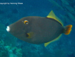 Gelbschwanz-Feilenfisch haben zwei Paare gelber, nach vorne gerichteter Stacheln am Schwanzstiel, die bei Männchen größer sind als bei Weibchen.