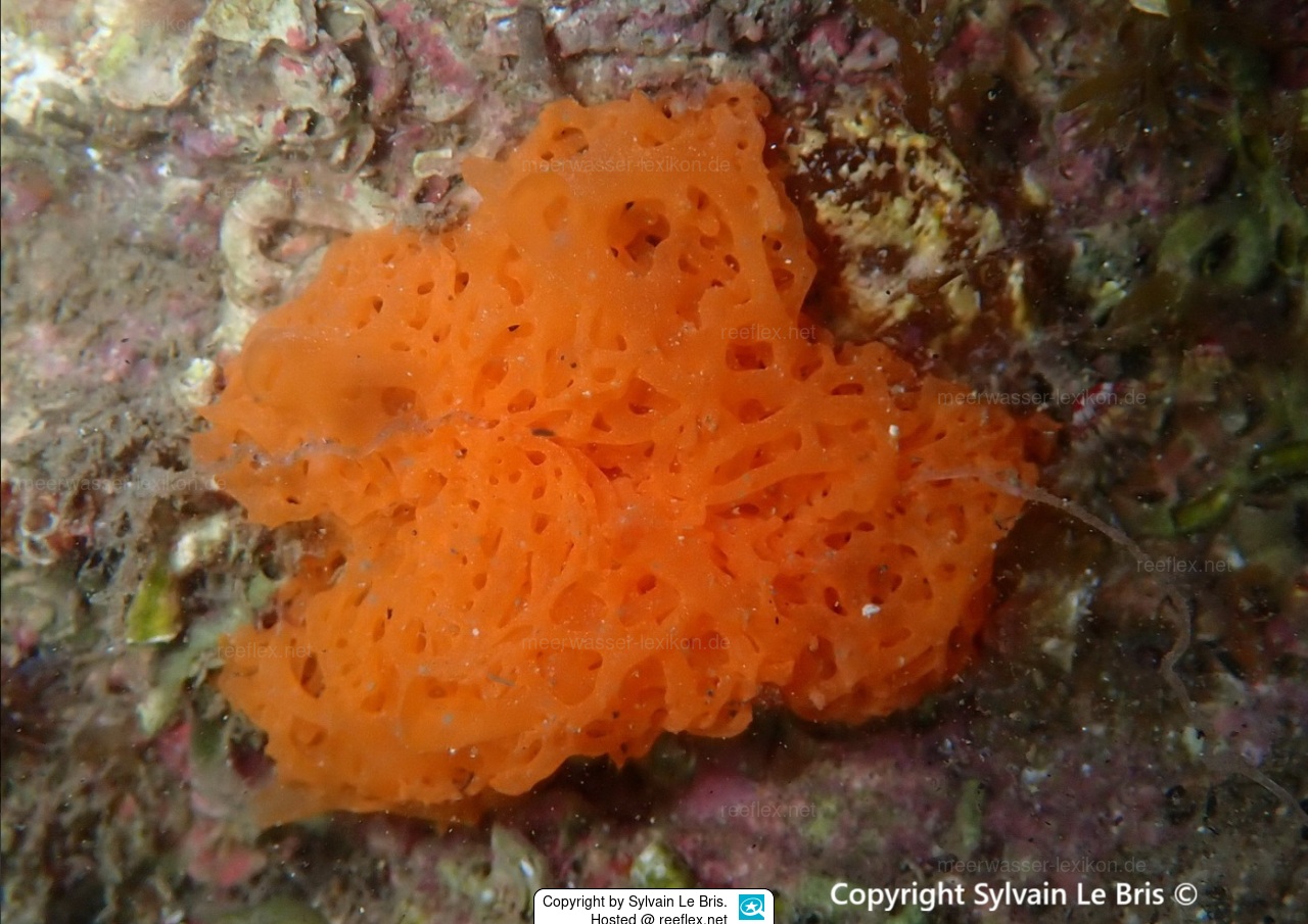 Dieser Gitterkalkschwamm ist orange, manchmal orange-rot. Die Gitterstruktur ist relativ weich und leicht zerbrechlich. Clathrina rubra wächst auf festem Untergrund, auf Muscheln und Steinen.