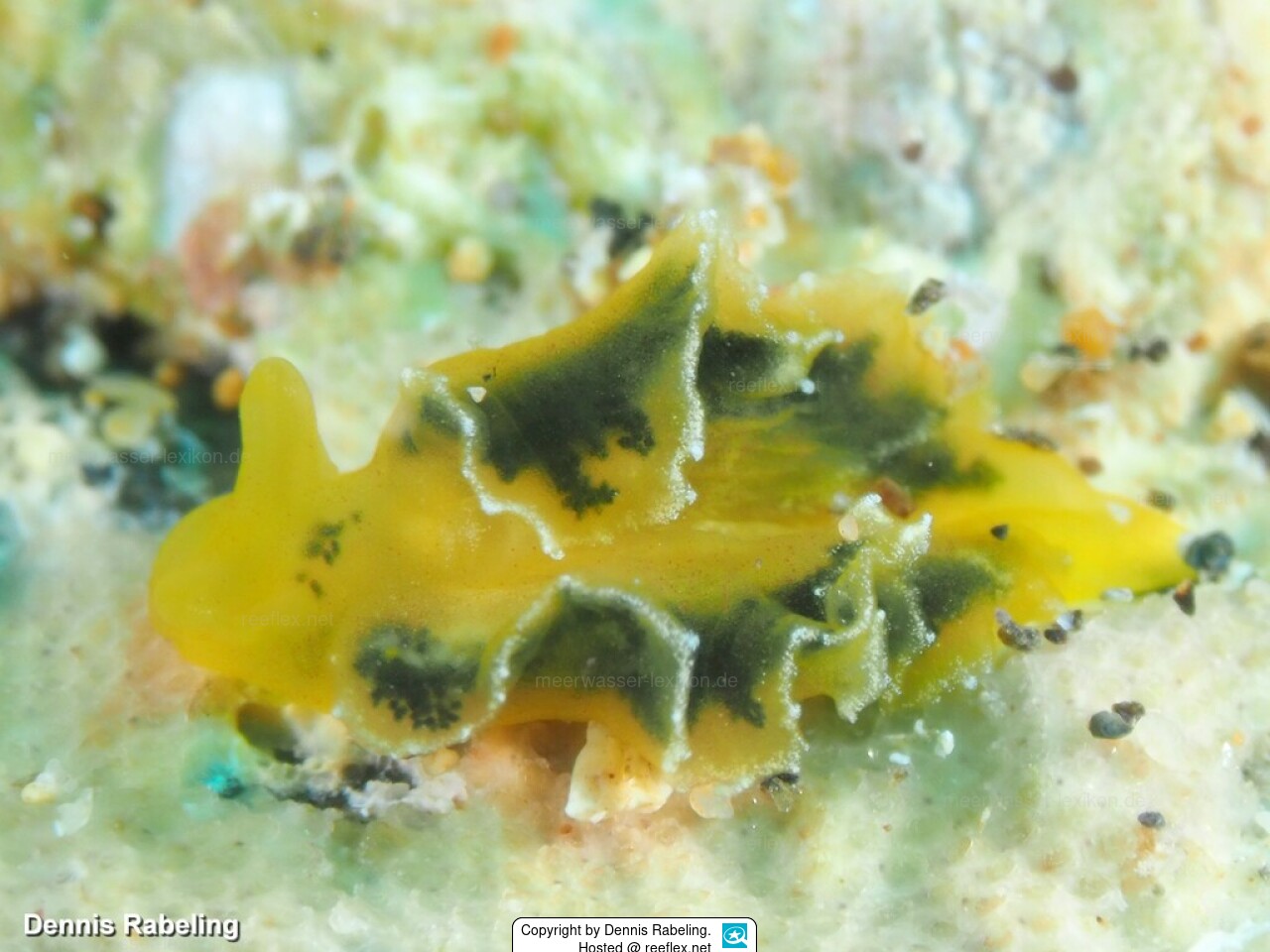 Elysia flava ist gelb mit dunkelgrünen Verzweigungen, die verschieden stark in Abhängigkeit vom Alter und der Herkunft des Tieres ausgeprägt sein können. Es gibt außerdem die Vermutung, dass die Farbintensität von Elysia flava von grün zu gelb abnimmt, wenn nicht genügend Futter vorhanden ist. Elysia flava hat einen weißen Randstreifen, der mit kleinen, weißen Papillen besetzt ist (sieht aus wie feines Granulat).