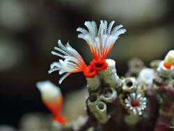 Röhrenwurm mit leuchtend roten Federn, die zu den Enden hin allmählich blass werden. Die Federn erstrecken sich aus dünnen weißen und gruppierten Kalkröhren.