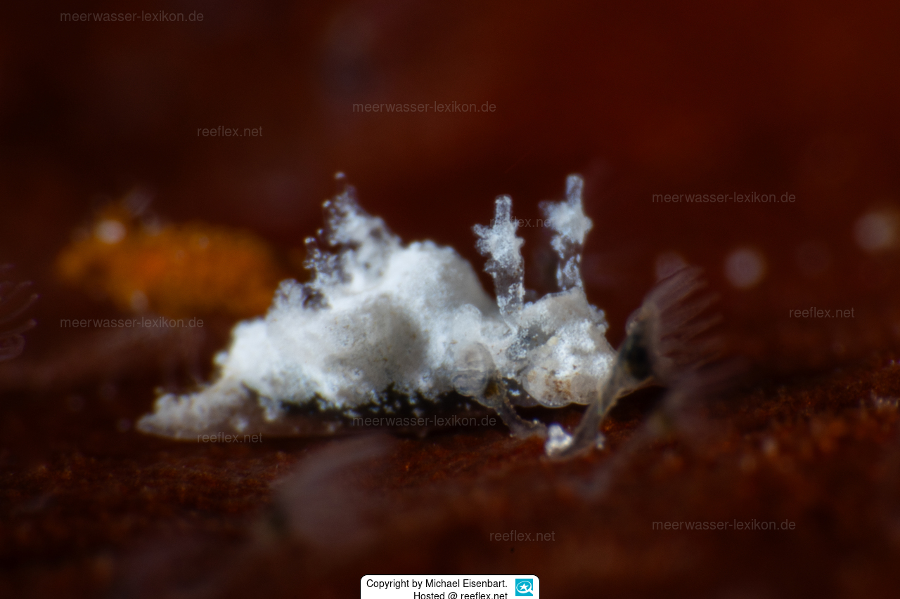 Trapania armilla hat eine unregelmäßig aussehende Oberfläche.Der Körper ist matt weiß,nur die oralen Tentakel weisen einen dünnen dunkelbraunen Ring auf.