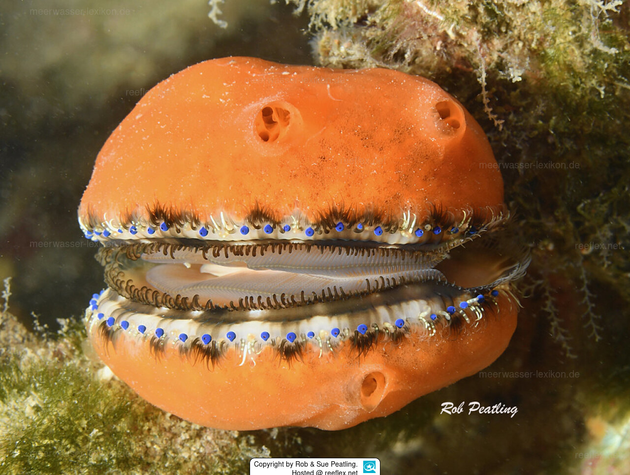 Die "Doughboy scallop" ist sehr farbvariabel, einschließlich orange, rosa und violett. Besonders auffällig sind die zahlreichen blauen Augen, die in einer Linie um den Rand der Öffnung liegen.