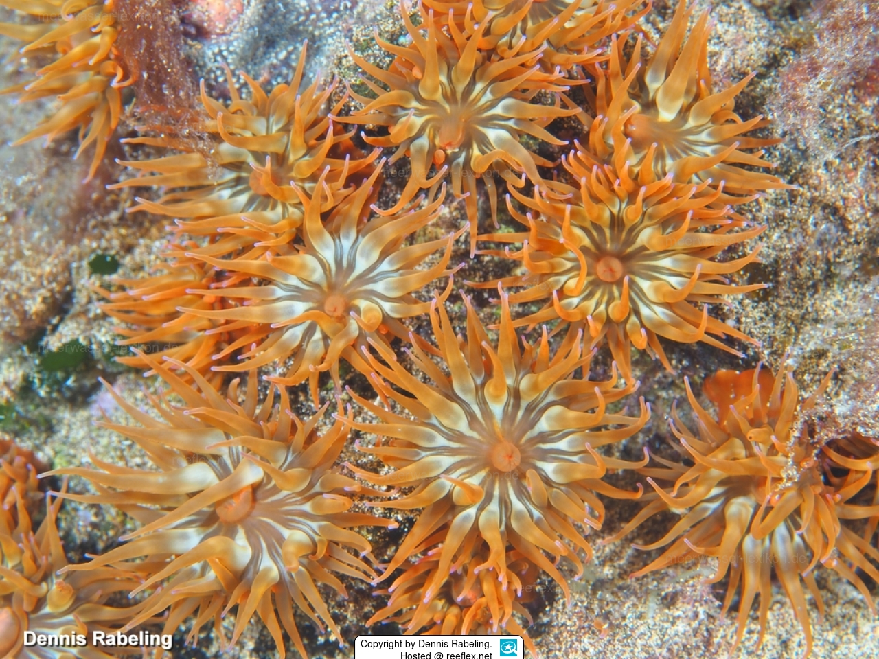 Die Tentakeln sind sechszählig in 4–5 Zyklen angeordnet (48–76 an der Zahl), mäßig lang (bis 6–19 mm Länge), glatt, schlank, sich distal verjüngend, die inneren länger als die äußeren, kontraktil, dunkelorange bis rötlich, manchmal mit weißlichen oder gelblichen Spitzen und rosa oder violetten Blitzen.