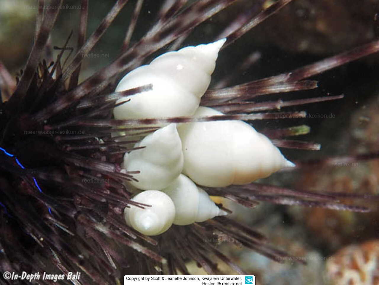 Echineulima robusta befällt Seeigel. Die eingestellten Fotos zeigen diese Schnecken auf dem Diademseeigel Diadema savignyi .