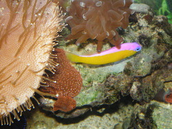 Der gering größere Lippfisch Paracheilinus mccoskeri wurde direkt attackiert, wenn er sich unter 20 cm annähert. In der Eingewöhnung wurden auch wehrhafte Gelbschwanzdemoisellen (Chrysiptera hemicyanea) immer nur kurz angegriffen, später wurden sie weniger beachtet. See-Anemonenfische, Doktorfische, Lyra-Kaiserfische, Feilenfische und Mandarinfische sowie eine einzelne Putzergarnele (Lysmata debelius) und ein Alpheus soror wurden nicht attackiert. Die Nachzucht dieser Art ist privaten Aquarianern bereits gelungen und entspricht der Nachzucht von Pseudochromis fridmanni.