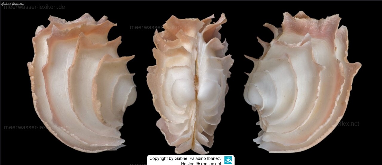 Charakteristisch für die Schale ist die sehr starke konzentrische Skulptur aus zurückgebogenen dünnen Schuppen (Lamellen), die sich über die gesamte Länge der Schale erstrecken. Die Lamellen brechen leicht ab. Die Außenfarbe der Schale ist dunkel cremefarben mit rosa Flecken. Die Innenseite der Schale ist weiß.