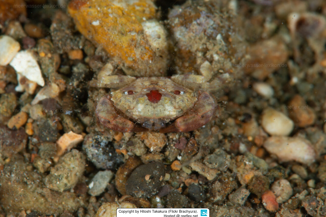 Beschreibung: Kleine Art. Panzer quer eiförmig und in beide Richtungen gleichmäßig konvex. Rücken mit granulierten Warzenhöfen. Vorderseite mit zwei Lappen, doppelt umrandet und mit zwei Reihen perlmuttartiger Körnchen gesäumt. Anterolateraler Rand mit vier konischen Zähnen. Kräftige Scheren mit abrupt gebogenen und klaffenden Scherenfingern. Die rechte schere ist nur geringfügig größer als die linke.
