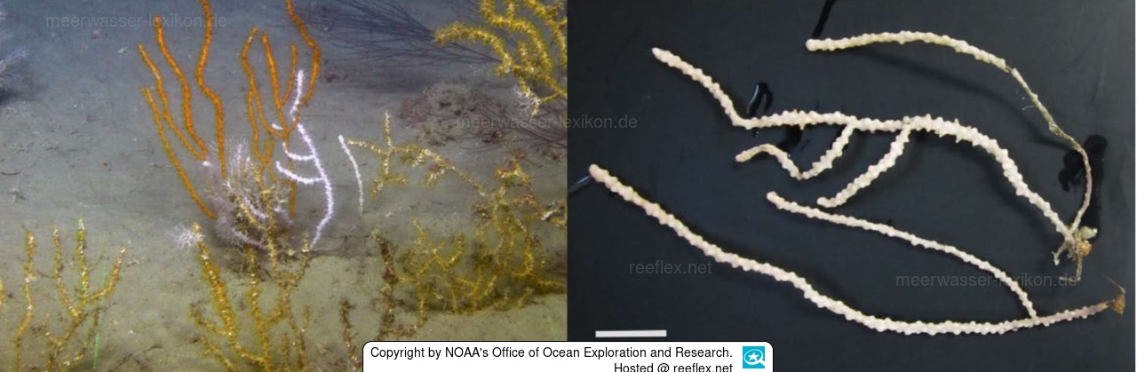 Thesea guadalupensis ist ein kleiner, spärlich verzweigter weißer Seefächer mit langen Ästen, die bis zu 20 cm hoch werden können.