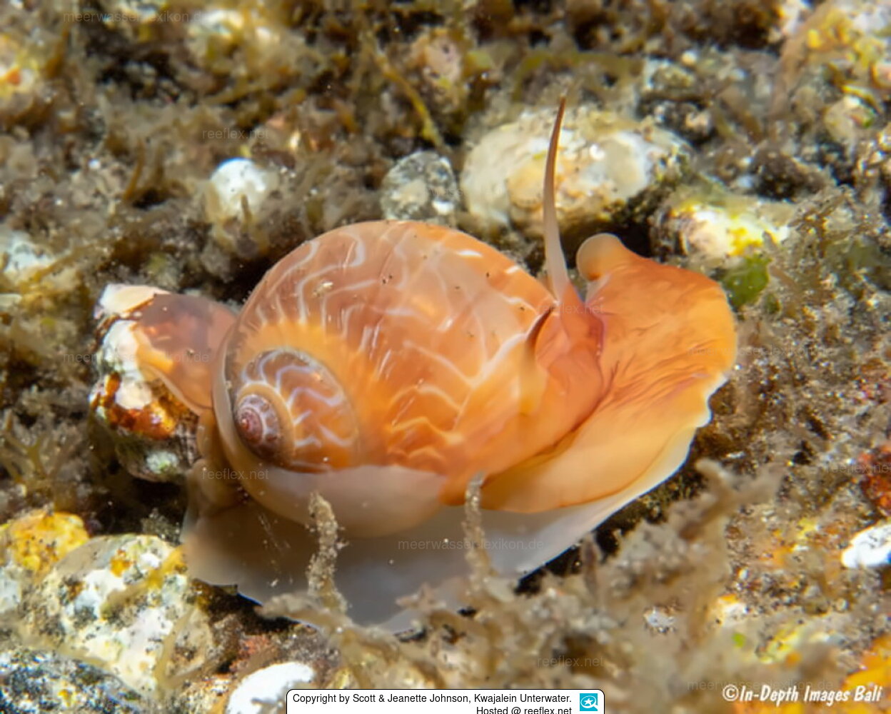 Die Schale ist glatt, dick, kugelförmig (nicht flach), mit etwas hervorstehender Spiralspitze. Das Schalenmuster ist braun mit Spiralen aus weißen Zickzacklinien. Auf der Unterseiteist eine kleine kreisförmige Vertiefung. Das Operculum zum Verschließen der Gehäuseöffung ist perlweiß mit einem gelben Fleck am Beginn der Windung und hat ein Ppar spiralförmiger Rillen am äußeren Rand.