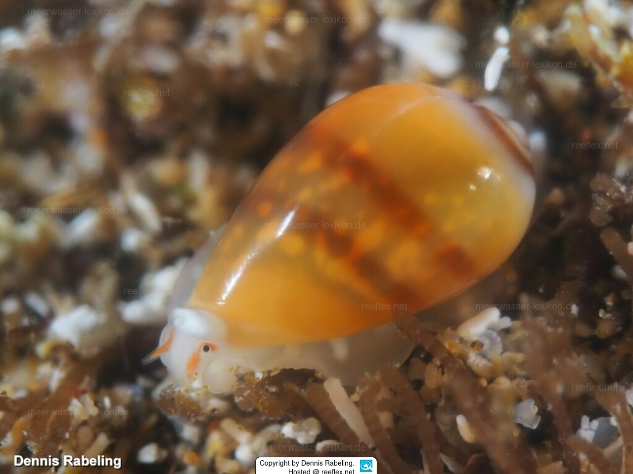 Der Mantel des lebenden Tieres ist im Innern der Schale glänzend, mit unregelmäßigen gelblichen und weißen Streifen, die mehr oder weniger ineinander verschlungen sind. Der Kopf ist schneeweiß mit einer rötlichen Seitenlinie hinter jedem Auge, die sich entlang der Tentakel bis zur Hälfte ihrer Höhe oder mehr fortsetzt.