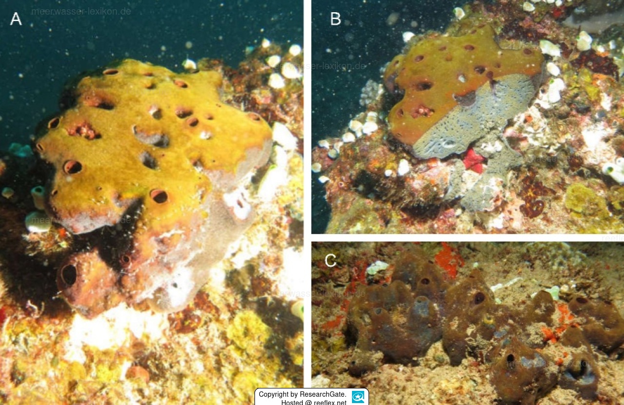 Dieser lebende Meeresschwamm ist unregelmäßig massiv, gelappt, mit Oskulen, die entweder bündig mit der Oberfläche abschließen, der sich in Hügeln öffnen.
