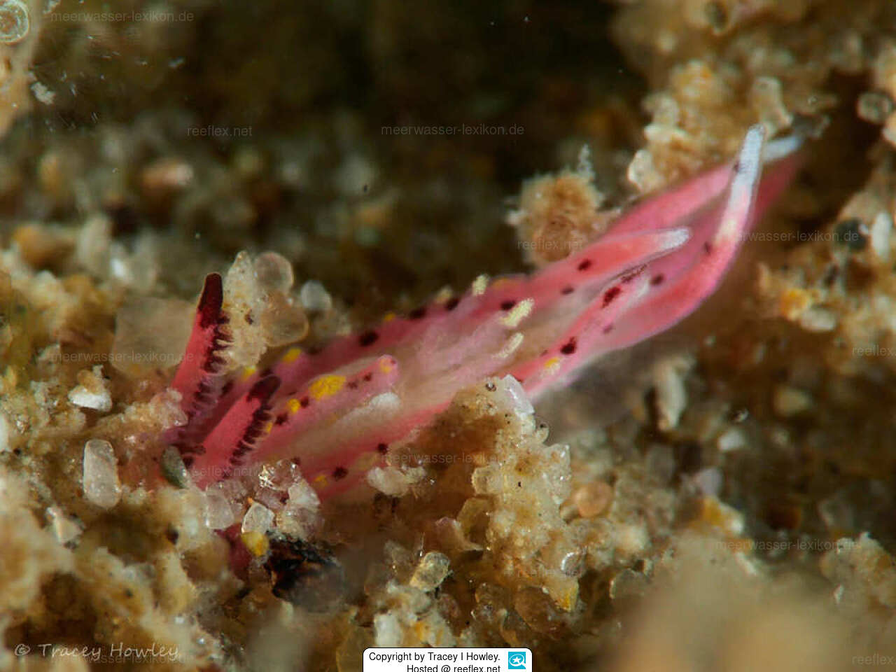 Die beiden langen, peitschenartigen Papillen haben eine gelbe Basis mit braunen Flecken und sind im distalen Drittel vollständig braun. Zwischen und hinter den Rhinophoren befindet sich ein großer weißer Fleck, der sich in zwei weiße Linien teilt. Innerhalb dieser Linien liegen die gelben, mit braunen Flecken durchsetzten, mitteldorsalen Papillenstümpfe. Die weiße Pigmentierung dieser Linien kann unterbrochen sein oder sogar vollständig auslaufen. Die Rhinophoren sind vorn rosa, manchmal mit vereinzelten weißen Pigmenten, während ihre Lamellen hinten in der basalen Hälfte durchscheinend weiß und in der distalen Hälfte sowie an der Spitze braun sind. Die Kiemen sind basal durchscheinend weiß, distal teilweise undurchsichtig weiß und gelb gespitzt. Fuß und Körperseiten sind durchscheinend. Der Schwanz ist dorsal rosa, manchmal mit weißer Pigmentierung im hinteren Bereich.
