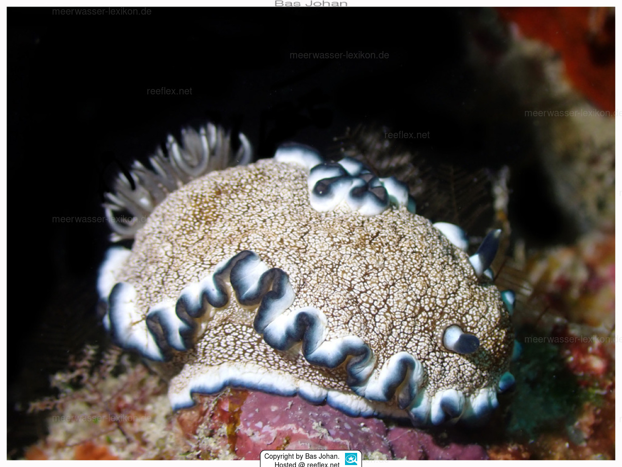 Beschreibung Ardeadoris pullata: Der Mantel ragt über den Fuß hinaus und ist am Rand stark gewellt. Die Grundfarbe des Mantels ist weiß, wobei der größte Teil von einem braunen Netzmuster bedeckt ist, durch das das Weiß in Form kleiner, teils erhabener Flecken durchscheint. Der dicke Mantelrand trägt ein dunkles Band, das ursprünglich als schwarz beschrieben wurde; eine bekannte Variante ist jedoch Dunkelblau. Unterhalb des Mantelrandes befindet sich ein undurchsichtiges weißes Band, das an der Stelle, wo der dunkle Rand auf dieses weiße Band trifft, in ein diffuses Braun übergeht. Das braun-weiße Netzmuster erstreckt sich bis zu den Körperseiten sowie zur Oberseite von Fuß und Schwanz. Die Ränder beider weisen dieselbe Anordnung farbiger Bänder wie der Mantelrand auf, wirken aber nicht geschwungen oder dick.