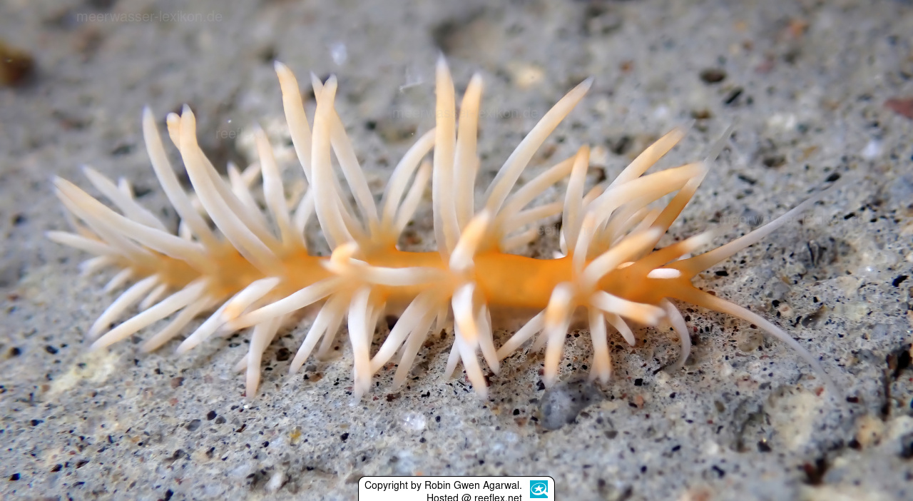 Beschreibung Caloria sp.04: Größe: 22 mm. Durchscheinend orange mit einer undurchsichtigen Linie vom Vorderende des Kopfes bis kurz hinter die Rhinophoren. Cerata gerade und undurchsichtig weiß, außer an den durchscheinenden Spitzen. Rhinophoren glatt, an der Basis orange, ansonsten größtenteils undurchsichtig weiß. Mundtentakel undurchsichtig weiß.