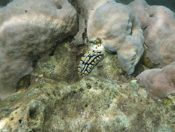 Verwechslungsmöglichkeit: Die juvenile Seewalze Pearsonothuria graeffei sieht der Warzenschnecke extrem ähnlich und schützt sich in diesem Stadium dadurch vor potentiellen Freßfeinden.