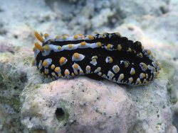 Phyllidia varicosa ernährt sich als Nahrungsspezialist von Schwämmen. Warzenschnecken sind Hermaphroditen (Zwitter).