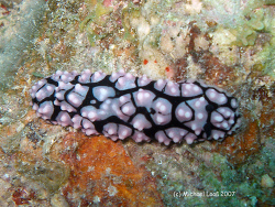 Seaslugs of Hawaii )übersetzt): Diese Art ist länglich und trägt niedrige, unregelmäßig geformte Büschel glatter, konischer, rosafarbener Tuberkel auf einem schwarzen Notum. Die Tuberkel sind meist einfach, gelegentlich verlaufen schwarze Linien an den Seiten größerer Büschel. Der Mantelrand ist blassrosa gesäumt, und die Rhinophoren sind schwarz. Unter Wasser betrachtet, kann das Tier aufgrund des Fehlens von rotem Licht in tieferem Wasser graugrüne Tuberkel vor schwarzem Hintergrund aufweisen.