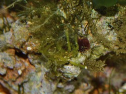 Huenia heraldica, sieht wie eine grüne Halimeda Alge aus und ist damit bestens getarnt. Sehr interessantes Tier, wie alle Dekorateur- Krabben. Unseres Wissen nicht gezielt zu bekommen, was an sich schade ist.