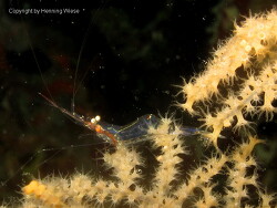 Die inneren Organe dieser Garnele sind rot. Der Sinn eines durchscheinenden Körpers ist eine Schutzfunktion, damit Fressfeinde die Garnele nicht genau fixieren und als fressbar einstufen können.