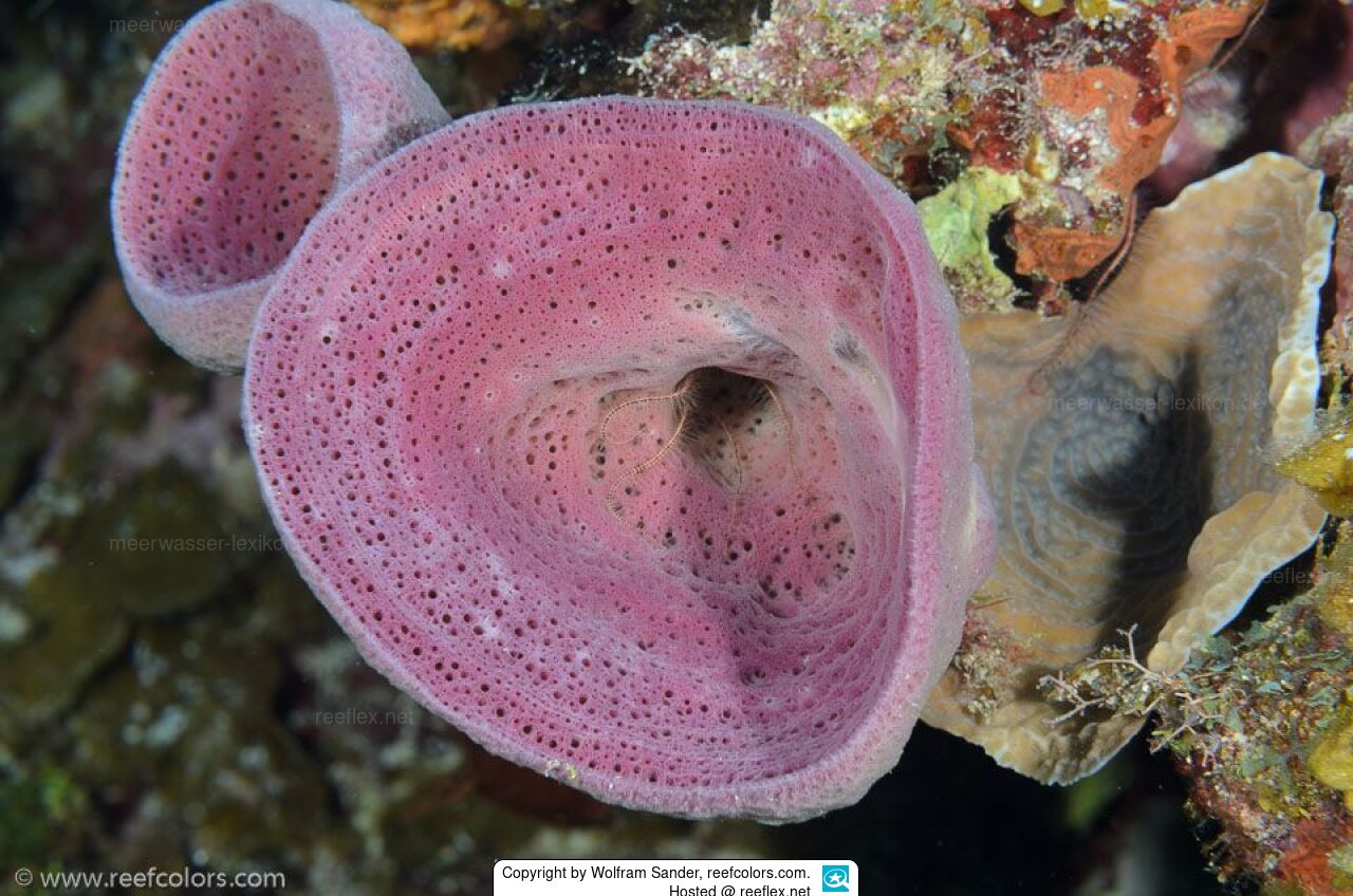 Der rosafarbene Schwamm wachst in Vasenform, Rohrform oder Tassenform.