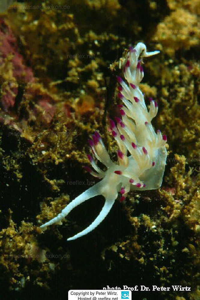 Flabellina llerae ist weiß mit lila Spitzen an den Cerata. Die Fadenschnecke ist ein Nahrungsspezialist, der sich von Hydrozoen (Polypen) ernährt. Der Laich wird in einem weißen Band abgelegt.