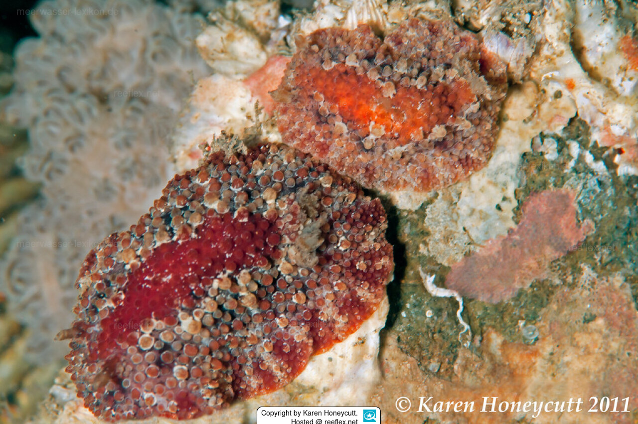 Carminodoris flammea wird bis zu 3,0 cm groß, ist ein Nahrungsspezialist und ernährt sich ausschließlich von Schwämmen.