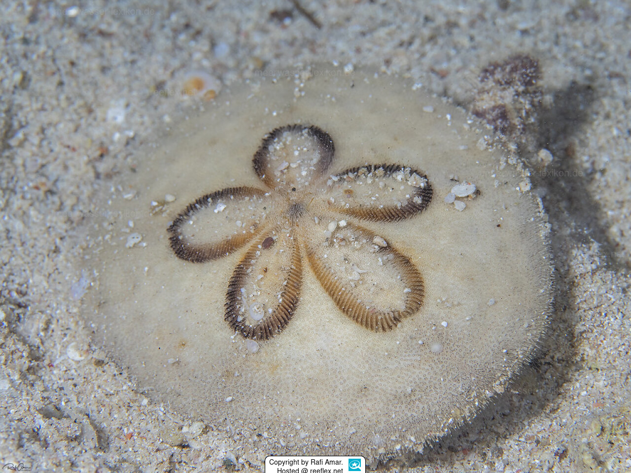 Der Rand ist ziemlich dick und der "Blütenblattbereich" ist über den Rest der Oberfläche angehoben. Die orale (Unterseite ist etwas konkav, die Nahrungsrillen sind lang und tief eingeschnitten. Die Stacheln sind kurz. Sie werden aufgrund ihrer abgeflachten Form als Sanddsollar bezeichent, im Engl. als "Sea Biscuit" . Lebende Exemplare sind grünlich-grau oder bräunlich, wobei der "Blütenblattbereich" manchmal dunkelbraun ist.