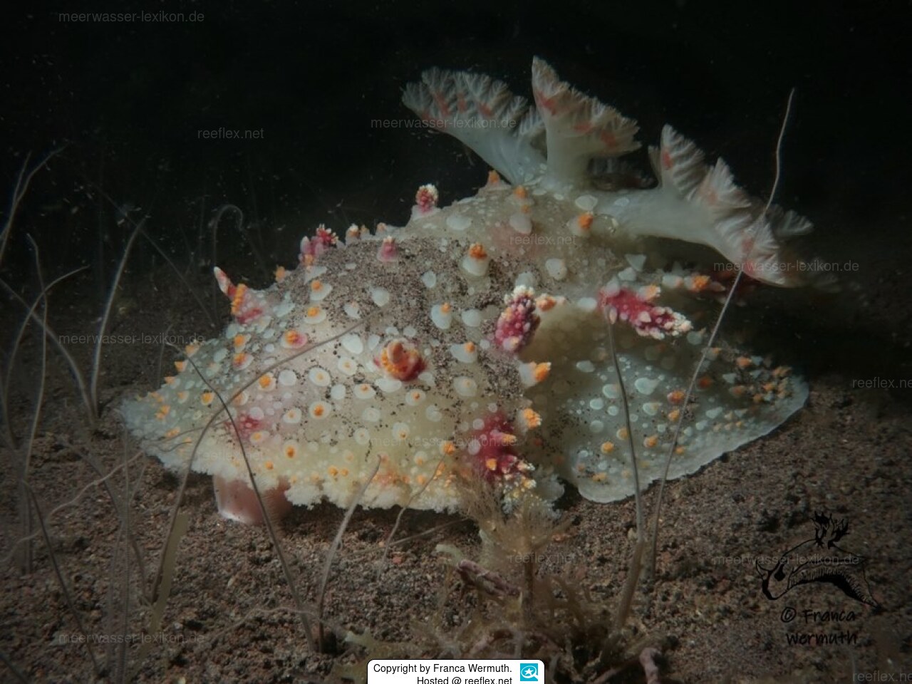 Die recht groß werdende Nacktschnecke ist überwiegend nachtaktiv und bevorzugt sandige oder schlammige Böden, in die sich sich eingräbt und kommt nur nachts auf Nahrungssucher hervor. Das ist auch der Grund warum sie Taucher sowenig zu Gesicht bekommen. Die Nacktschnecke ist weiß mit kleinen weißen und größeren rötlichen Papillen.