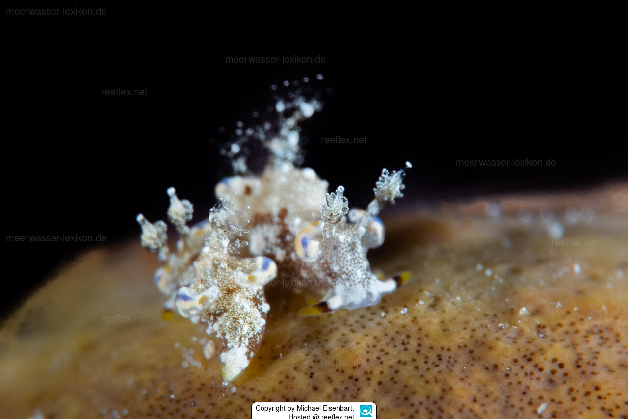 Die zusätzlichen Anhänge an den Rhinophoren und Kiemen haben eine hellbraune Basis und Spitze, in der Mitte ein weißes Feld mit einem diagonalen blauen Streifen.